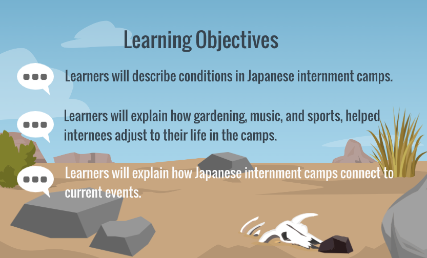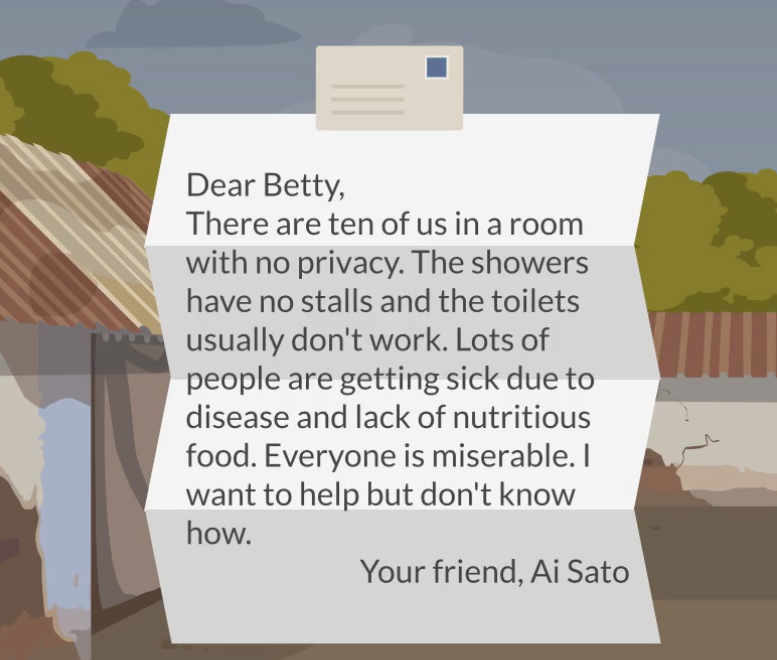 Finding Home is based on a prompt about an instructor, Bob Reckowsky, who wanted his students to be engaged in their history class. I created a game about the Japanese internment camp experience in Manzanar. The game starts with our protagonist, Ai Sato, saying goodbye to her best friend, Betty, because Ai's family is forced into an internment camp. The contrast between their two worlds will be reflected in the letters that the girls send to each other. Ai's family was allowed to carry one personal item into the camp. Ai's father brought seeds from his garden, Ai's mother brought her koto (a stringed instrument), and Ai brought her baseball glove. Using these three items, I created three overarching goals with many small tasks needed to be completed to reach each goal. I focused on gardening, the performing arts, and baseball since these three things were positive experiences that many internees wrote about to balance the tragic historical events that will also be discussed in the game.