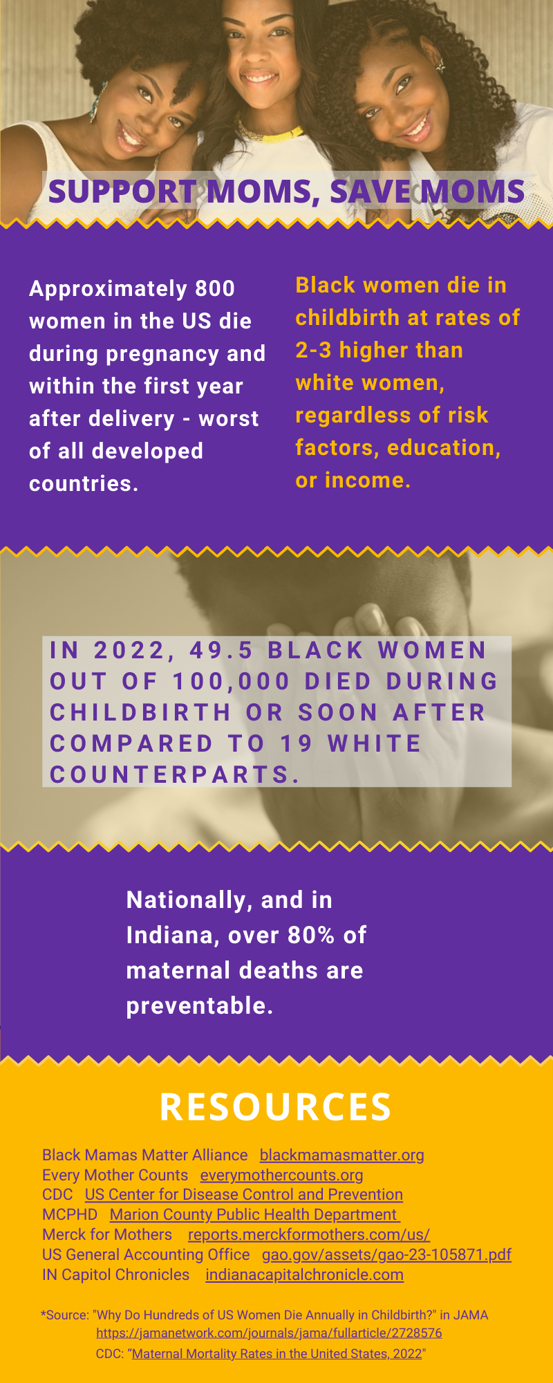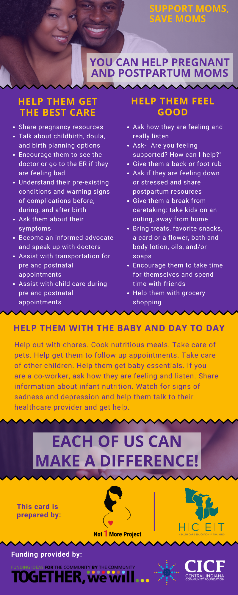 We were asked to create an infographic for Not1More, an organization focused on Black maternal health issues, to provide information and suggestions on ways to support Black pregnant and postpartum moms.